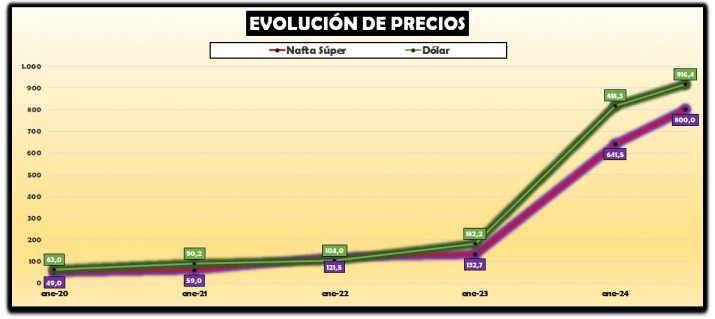 Mientras el precio de la nafta súper fue del 383,4% el incremento del precio del dólar oficial fue del 349% entre enero del 2023 y el mismo mes de este año. Una diferencia similar se registró hasta julio ya que el dólar aumentó un 12% y la nafta un 24,7%.