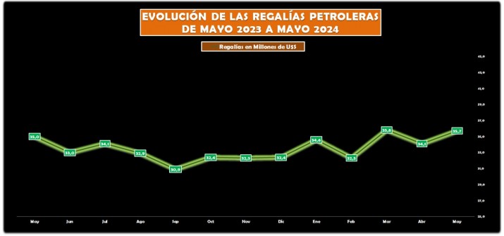 El mes de mayo dejó un saldo positivo para la provincia en materia de regalías petroleras, las que alcanzaron los 35,7 millones de dólares y revirtió transitoriamente la tendencia negativa que se había desarrollado en el arranque del 2024.
