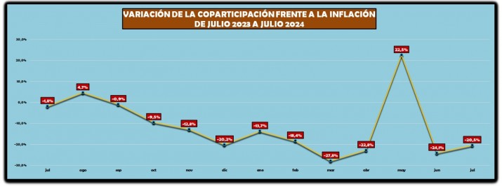 La Coparticipación neta, que es el rubro que concentra la amplia mayoría, varió negativamente un 21% en julio y fue muy significativa la caída del reparto en la recaudación del IVA que se contrajo el 11,8%. También se contrajo notoriamente la distribución de los Bienes Personales, con una retracción interanual del 90,4%.