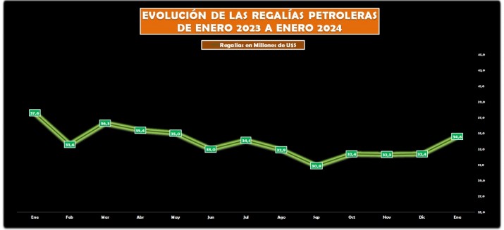 La Secretaría de Energía de Nación reveló los datos de las regalías petroleras cobradas por Chubut en el primer mes del año y otra vez retrocedieron de manera interanual. En enero la provincia recaudó 34,6 millones de dólares y fueron menores en casi 3 millones respecto de lo que se había recaudado en el 2023.