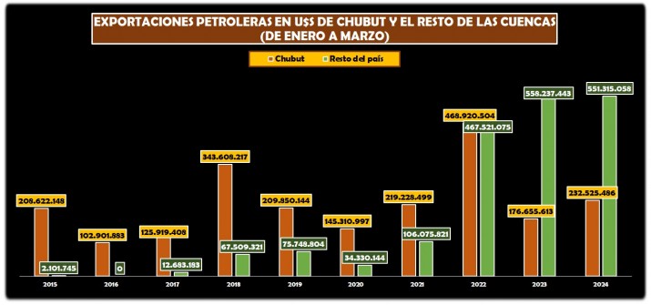 Durante marzo Chubut exportó petróleo por 84,3 millones de dólares que fueron un 37% más abultados que los 61,5 millones del mismo mes del 2023.