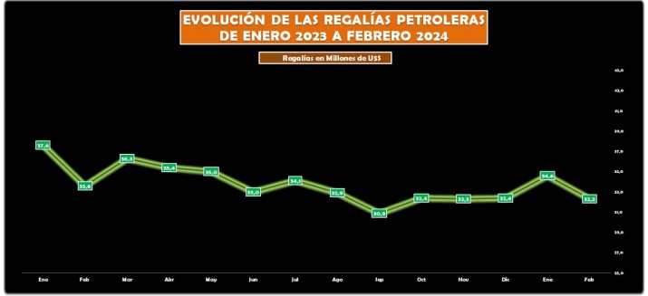 La merma en la producción petrolera sigue haciendo bajar los ingresos por regalías petroleras de Chubut. En febrero se recaudaron 32,3 millones de dólares y fueron 1,3 millones menos que en el mismo mes del 2023. En abril se producirá un nuevo vencimiento de la deuda en dólares del BOCADE y la provincia deberá afrontar una cancelación superior a los 34 millones de dólares. Las regalías que se recaudan son inferiores a los pagos trimestrales por ese endeudamiento.